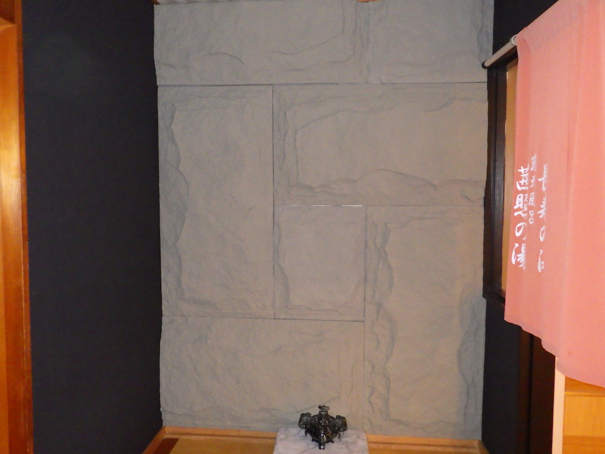 この度、真鶴半島や相模湾、湯河原の街並みの景観は湯河原一と評されているホテルあかね様からご用命いただき、大浴場の入口壁面にこの新素材軽量パネルを施工させていただきました。